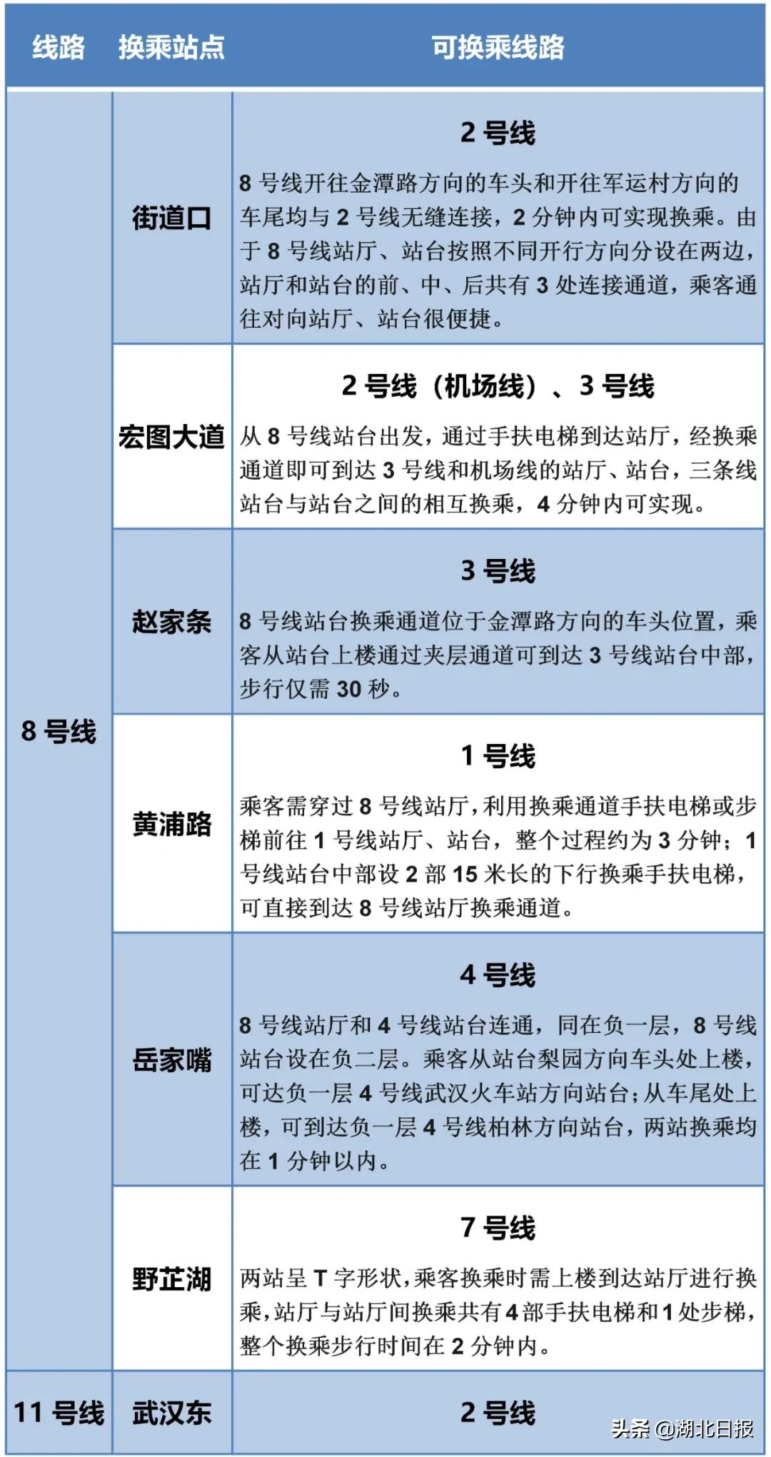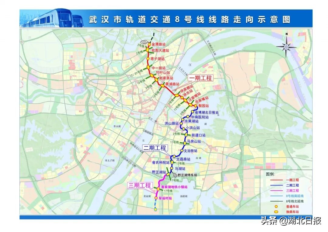 2日开通的轨道交通8号线二期工程,与8号线一期、三期工程贯通,全线里程达到 39公里,串接起东湖风景区、省博物馆、水果湖行政中心、街道口商圈、多所高校及南湖大型居住区,成为跨越长江的重要客运交通走廊。