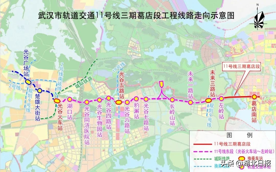 地铁11号线是武汉市轨道交通网络规划中东西向的重要过江快速轨道骨干线路。葛店段一站一区间,全长3.7公里,西起11号线一期终点左岭站,沿高新大道北侧向东延伸至曹岭路交会处,设地铁终点站——葛店南站。