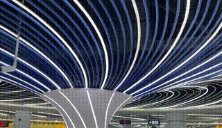 通过编钟上楚文形态,将楚文抽象化处理,重新组合成新的结构形态,以平面构成的手法图案与灯光相结合,以天花铝板方通等材质来表现。