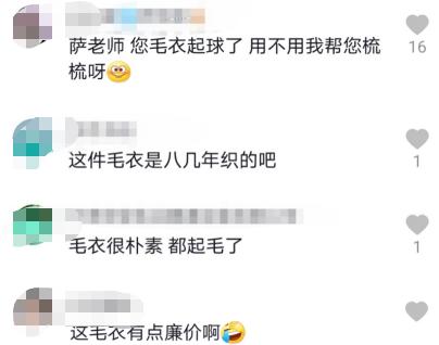 网友也注意到了萨顶顶的毛衣尺寸和质量似乎都不太对,有人在评论亲切地称其为萨老师,表示毛衣都起球了,怎么还在穿。也有人调侃说,这件毛衣是八几年织的吧,显得有些廉价。