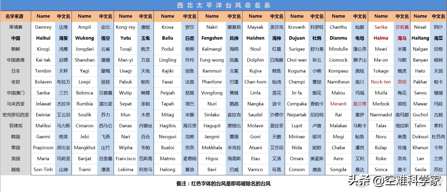 命名表共有140个名字,分别由世界气象组织所属的亚太地区的11个成员国和3个地区提供,按顺序分别是柬埔寨、中国大陆、朝鲜、中国香港、日本、老挝、中国澳门、马来西亚、密克罗尼西亚、菲律宾、韩国、泰国、美国以及越南。