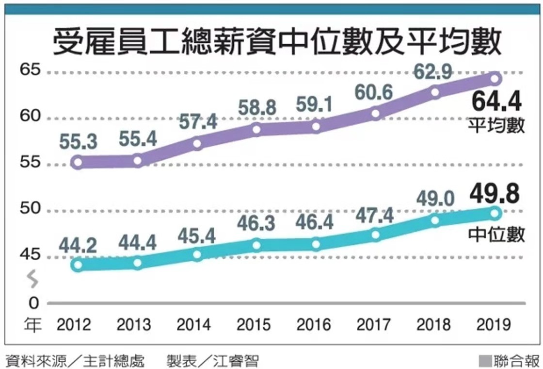 2019年,台湾25岁以下的受雇员工全年薪资中位数只有34.9万(约合8.1万人民币),在各年龄层中位居末尾。以月入而言,2018年,25岁以下者为2.81万元(约合6500元人民币),25~29岁者为3.85万元(约合8900人民币)。