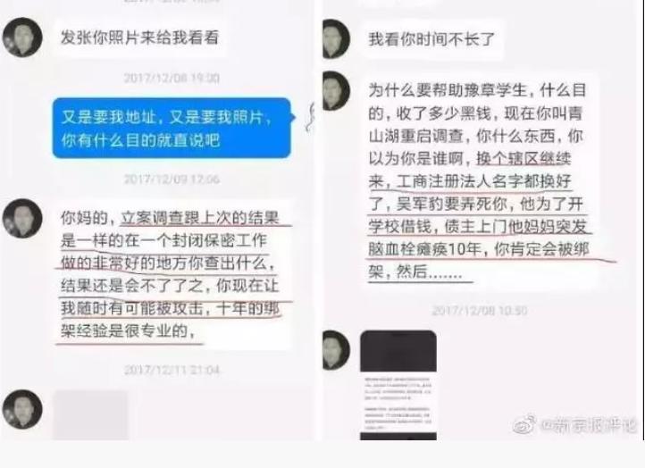 两年前自称能改变“问题少年”豫章书院令人发指的“地狱”行为被曝光。近期最新消息,曾举报豫章书院的志愿者对外称其遭到死亡威胁。昨天,原豫章书院山长吴军豹接受媒体采访时回应称,其从来没有授意谁去威胁过志愿者,“被死亡威胁的志愿者已报警,一切以警方信息为准”。