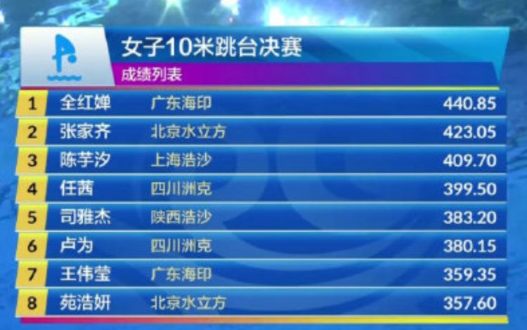 作为梦之队最年轻的冠军级选手,广东小将全红婵表现出色,虽然只有14岁,但是面对世界冠军们与姐姐们展现无与伦比的竞技力,第一轮虽然以78分位列第二,但在此后的四跳中,均拿下高分,后四轮保持成绩第一,最终以总分440.85拿下冠军。这个成绩优势还是很大的,张家齐亚军的成绩是423.05。陈芋汐分是什么概念呢?2016年里约奥运会女子10米跳台决赛,任茜夺冠成绩是439.25分。所以,全红婵已经具备奥运夺冠的水准了。