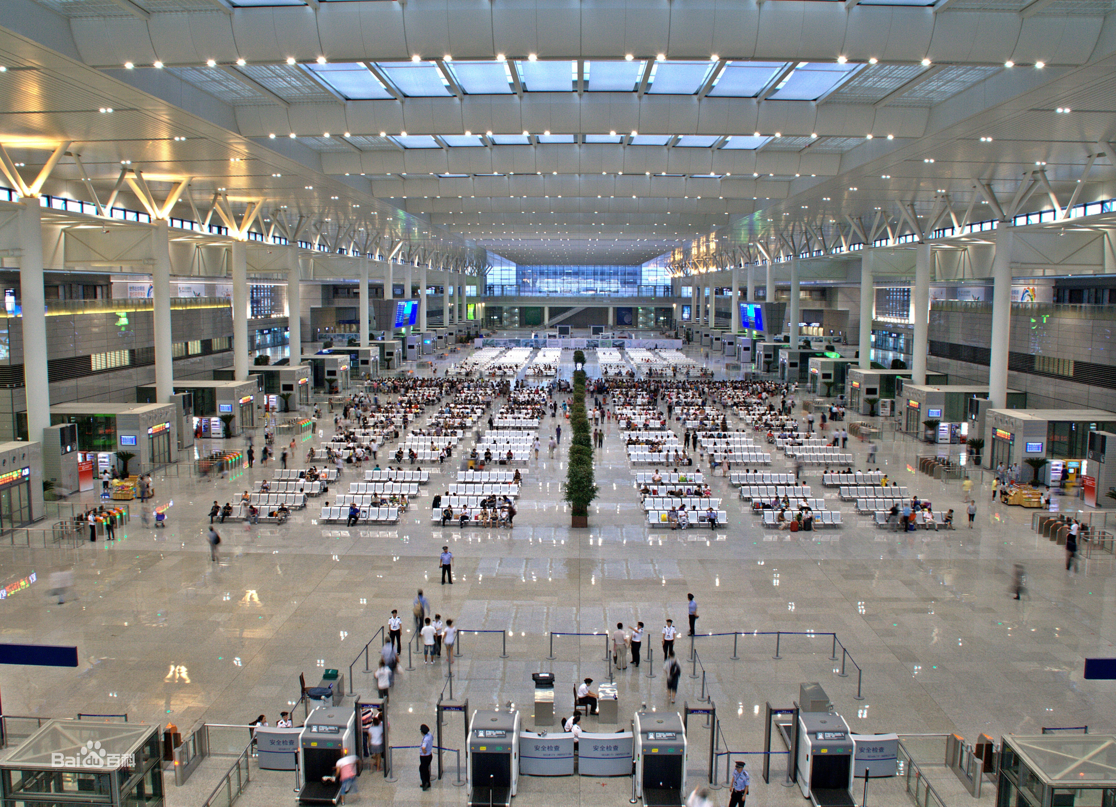 车站候车大厅面积约11340平方米,最高可同时容纳1万人候车。候车大厅是全开放的空间,不设立分隔的候车室,旅客进入站厅后,可以在候车区域内等候,也可前往商铺购物或到观光平台游览。旅客可通过南北高架平台、各条公交线路直接进站,地下可从交通换乘大厅乘坐自动扶梯进入候车厅。检票口主要分列在候车大厅两侧,检票口上方的电子屏幕显示车次名称和开车时间,旅客可根据车票上的信息选择相应检票口就近候车;每个检票口都设有自动检票闸机,上面标有“检票入口”、“刷卡区”等字样,车次开检时乘客使用车票或二代身份证检验无误后闸机就会开放。