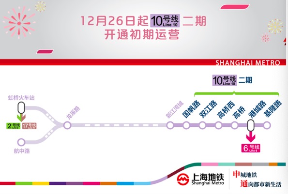 记者从上海轨道交通10号线二期、18号线一期南段通车试运营新闻通气会上获悉,上海轨道交通10号线二期工程为10号线一期工程的东延伸段,起于10号线一期新江湾城站,终点为基隆路站,经过杨浦区、浦东新区,运营线路长度为9.8公里,全线共设国帆路、双江路、高桥西、高桥、港城路、基隆路6座新站,其中高架车站5座,地下车站1座。在港城路站可与6号线进行换乘。至此,10号线全线累计运营线路长度将达到45公里,运营车站37座。
