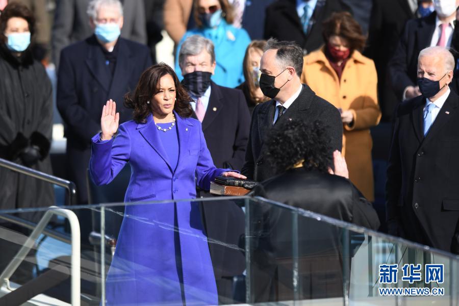 1月20日,在美国首都华盛顿国会山,哈里斯(前左)在就职典礼上宣誓就任美国副总统。