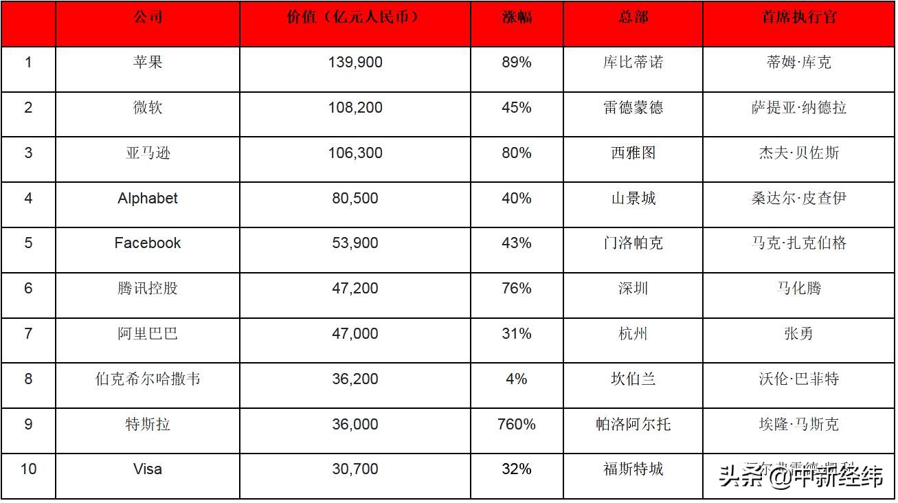 中国是世界涨幅最快的国家,51家上榜企业总价值比去年增长73%,达到35万亿元,几乎是排在其后的日本、法国和英国三个国家的总和。排名第一的是腾讯,价值4.7万亿元;阿里巴巴紧随其后,这是榜单前十中仅有的两家非美国公司,也是第一次有两家中国企业进入全球十强。