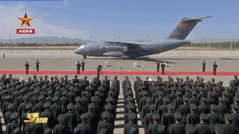 视频中,大型军机抵达机场,将士们列队集结,仪仗兵捧着遗像,后面棺椁中是归来的烈士。