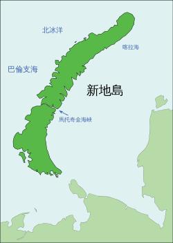 新地岛南、北两大岛之间是马托奇金沙尔海峡,宽仅1.6-2.4公里,且由于极地气候,冰天雪地,两岛被冰雪粘连在一起。