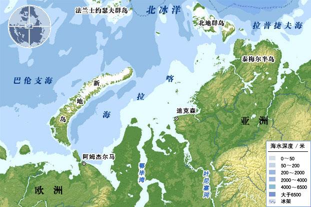 ②新地岛,位于北冰洋中,介于巴伦支海与喀拉海之间,由南、北2个大岛组成,加上附近小岛,绵延1000多公里,总面积82600平方公里。
