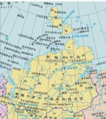 ①泰梅尔半岛,是亚洲最北部的半岛,位于西伯利亚的北部,西面是喀拉海,东面是拉普捷夫海,北隔维利基茨基海峡与北地群岛相望,面积约40万平方公里。