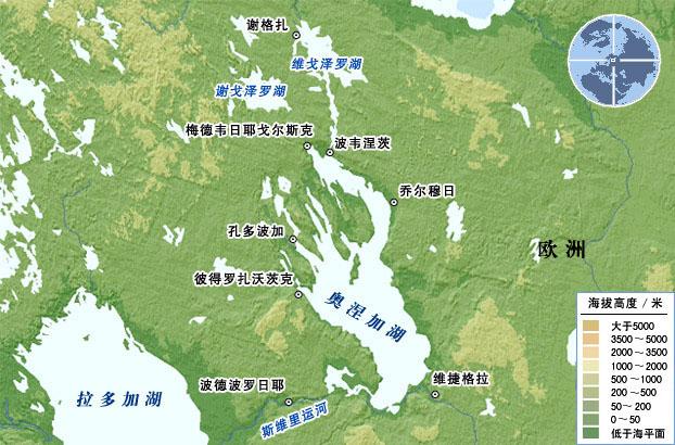 ①奥涅加湖,位于俄罗斯的西北部,属冰川构造湖,面积9700平方公里。平均水深30米,最大深度120米,湖中有1369个小岛,有58条河流注入。