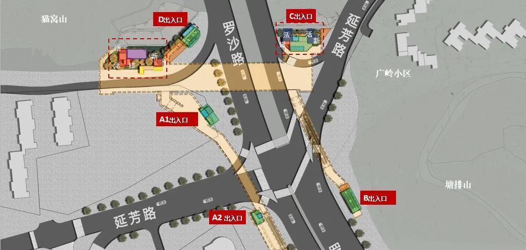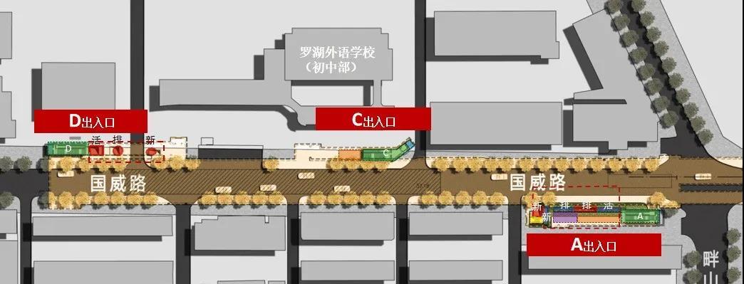 其中,A口位于国威路南、畔山路西侧;C口位于国威路北侧、罗湖外语学校(初中部)前方;D口位于国威路北、罗湖外语学校(初中部)西侧。
