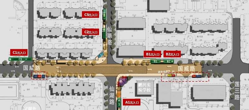 其中,A1口、A2口位于仙湖路东、鹏兴实验学校旁;B1口、B2口位于国威路北侧、仙湖路东侧旁;C2口、C3口位于仙湖路西侧、与仙湖路南北向平行;C1口位于仙湖路西侧、与国威路东西向平行(预留)。