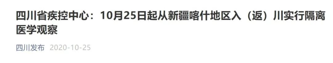 四川:10月25日起,从新疆喀什地区乘坐火车、飞机等交通工具入(返)川时,要主动配合健康码查验,返回后主动向所在社区报备,实行隔离医学观察。