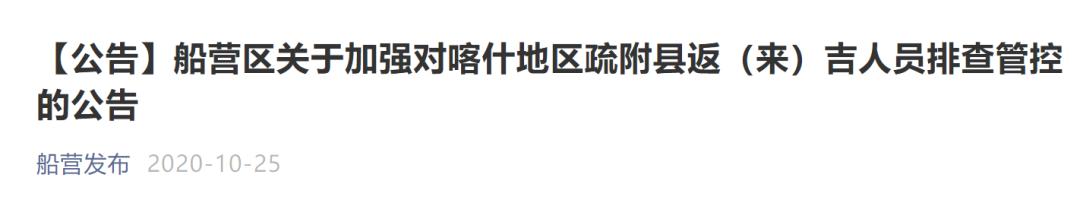 其中,吉林市船营区要求:10月10日以来从喀什地区疏附县返(来)吉人员要第一时间主动向所属社区、村(屯)和单位报告登记。宾馆、旅店、招待所、出租房、民宿、网吧、洗浴等各类住宿场所要严格落实住宿人员登记制度,如发现喀什地区疏附县旅居史人员立即报告。10月10日以来从喀什地区疏附县返(来)吉人员须提供抵吉前7天内核酸检测阴性证明或能够出示包含核酸检测阴性信息的“健康码”或“通行码”绿码,对无法提供核酸检测阴性信息的,须第一时间接受核酸检测。