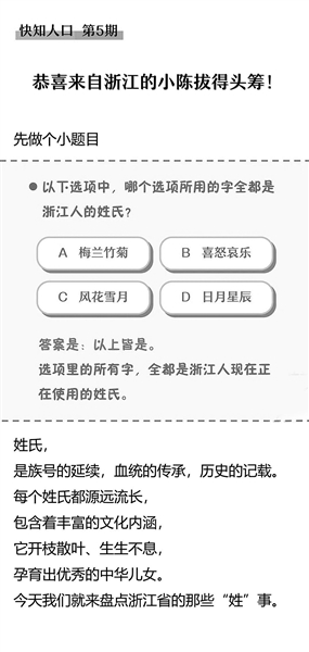这次统计发现,春夏秋冬、东南西北、江河湖海、花草树木都是姓氏,甲乙丙丁戊、一二三四五都是姓氏。就连浙江十一个地市(杭宁温嘉湖绍金衢舟台丽)名也是姓氏,红橙黄绿青蓝紫这些颜色也是姓氏。