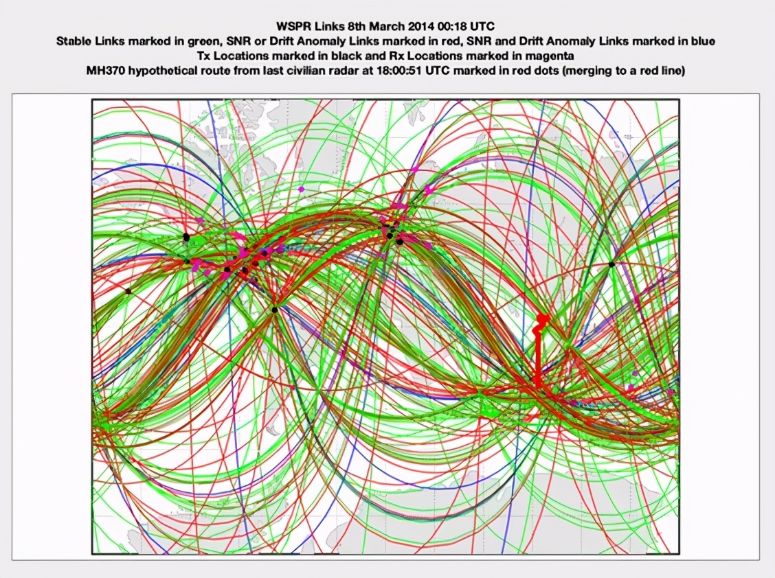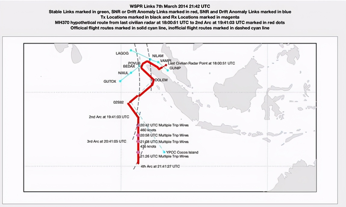 因为MH370是从雷达图上突然消失的,外界无法获悉它消失后的航线轨迹,戈弗雷就借助两个民用的WSPRnet和Inmarsat卫星数据,利用它们当时在事发区域对一切物体追踪的微弱信号,判断出了马航MH370航班在最后时间段内执行的复杂几个操作,主要包括是三点。