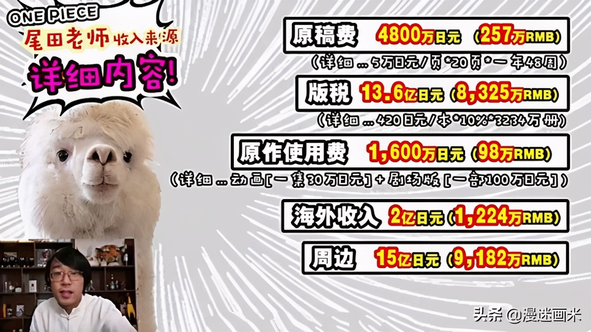 尾田荣一郎的收入在16年的时候就已经是31亿日元,那时候的《海贼王》的发行量是3亿多本,但是漫画稿费却只占了1%,大多收入都是周边,电影,海外收入,动画片带来的。