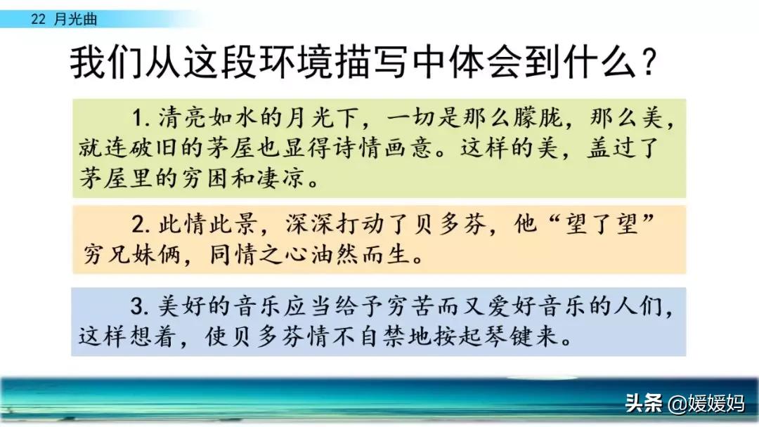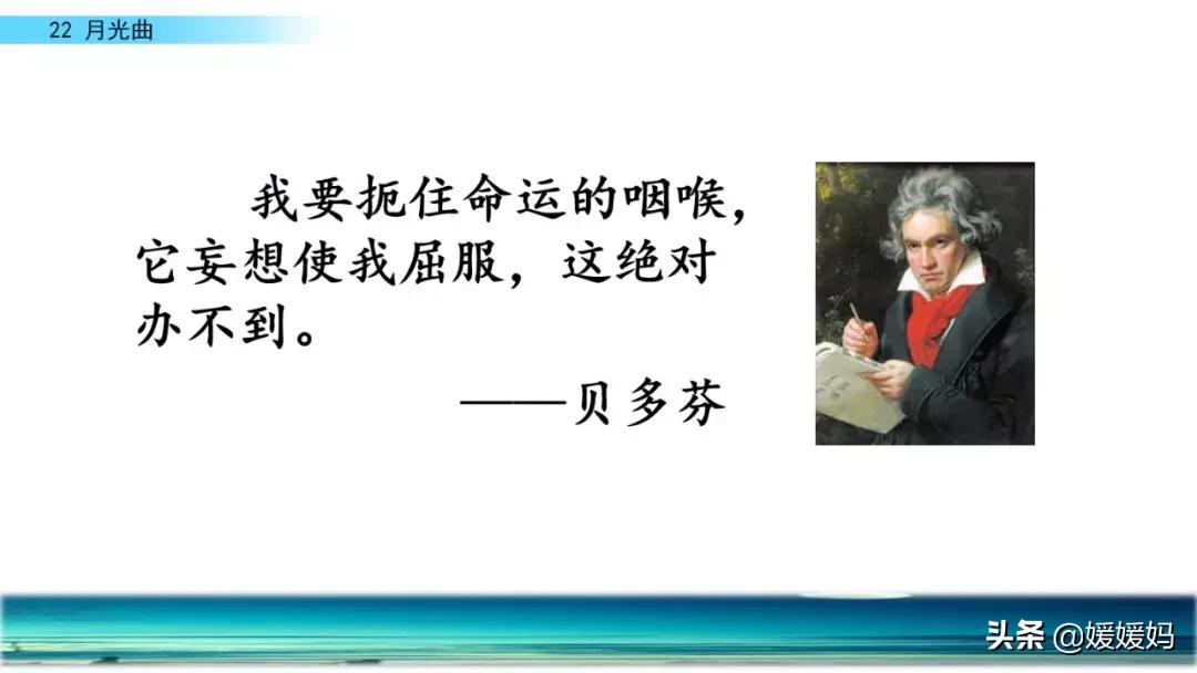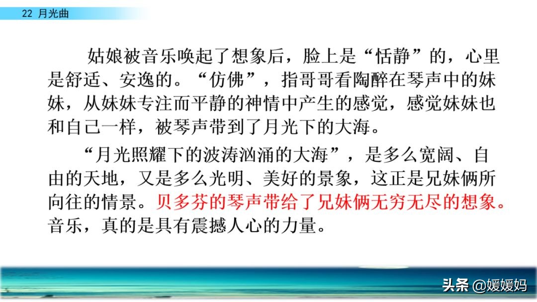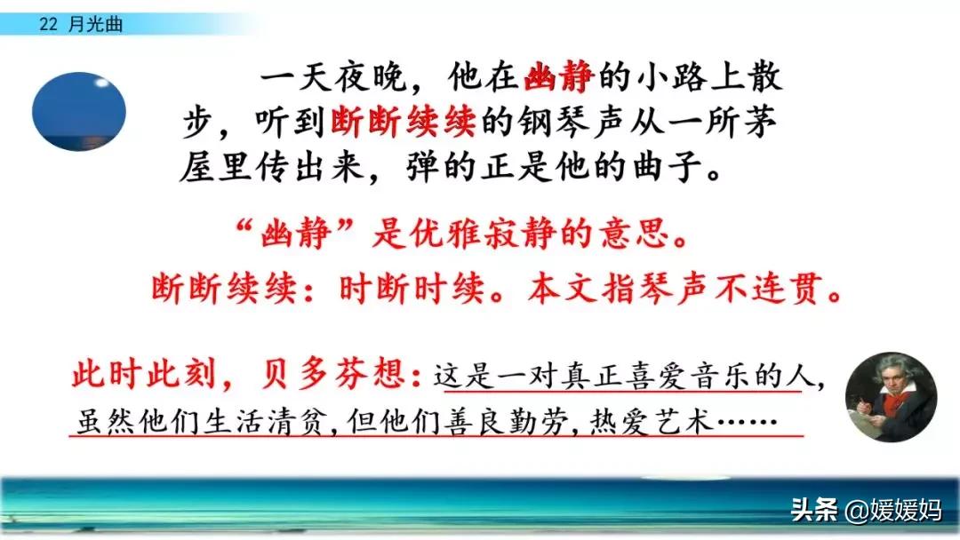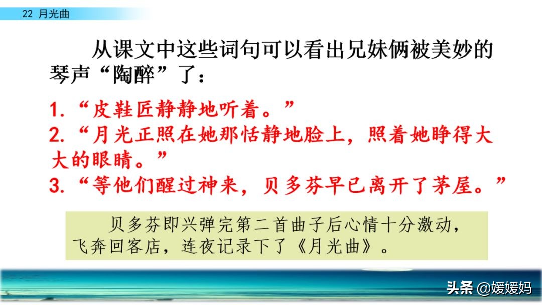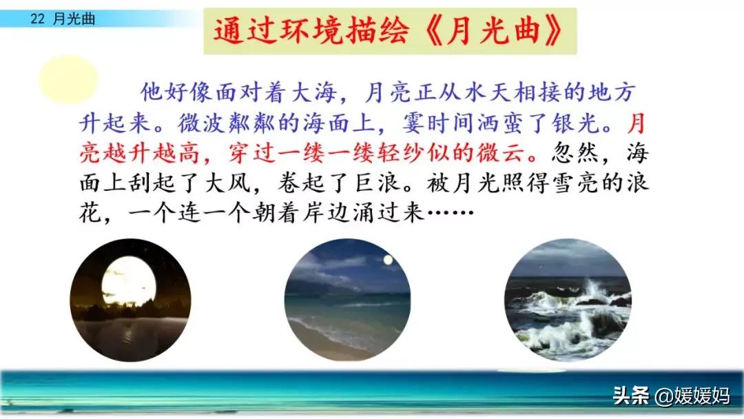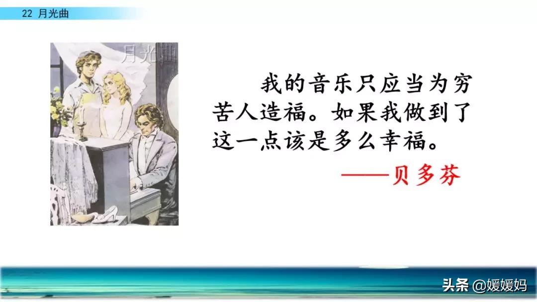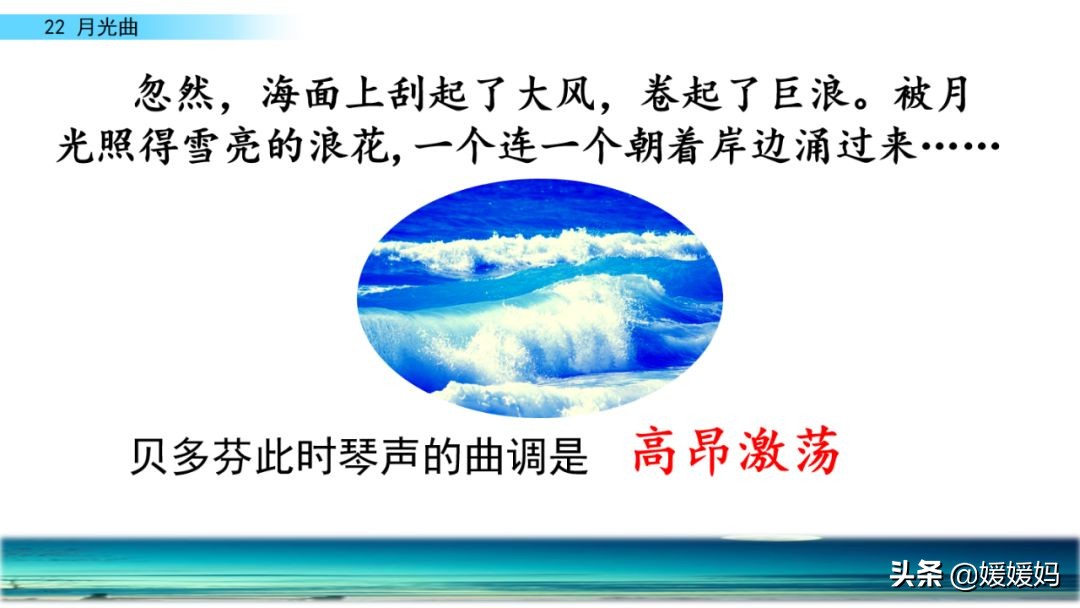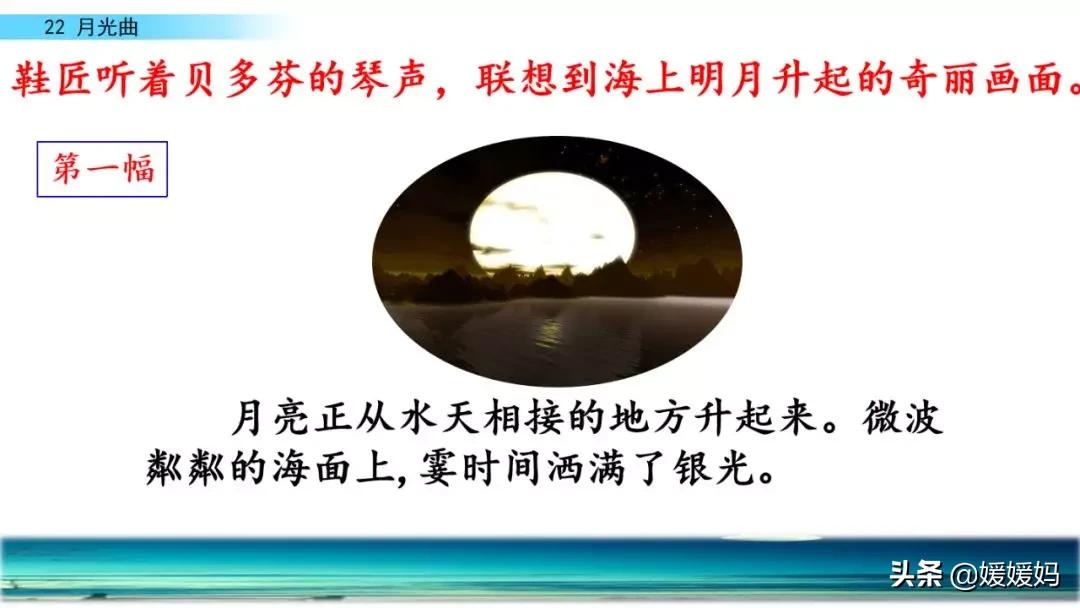 听着贝多芬的琴声,我们可以联想到海上明月升起的奇丽画面。第一幅:月亮刚从“水天相接”处升起,平静的海面上“洒遍银光”。此刻,贝多芬轻轻地按着琴键,音乐轻幽、舒缓。第二幅:月亮越升越高,穿过天空出现的“一缕缕轻纱似的微云”。随着景象的变化,音乐气势逐渐增强,曲调出现了波折。第三幅:“忽然,海面上刮起了大风,卷起了巨浪。”强音乐骤然响起。月光照耀,浪花“涌过来”,气势凶猛,音乐高昂激越,节奏越来越快。