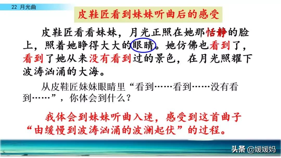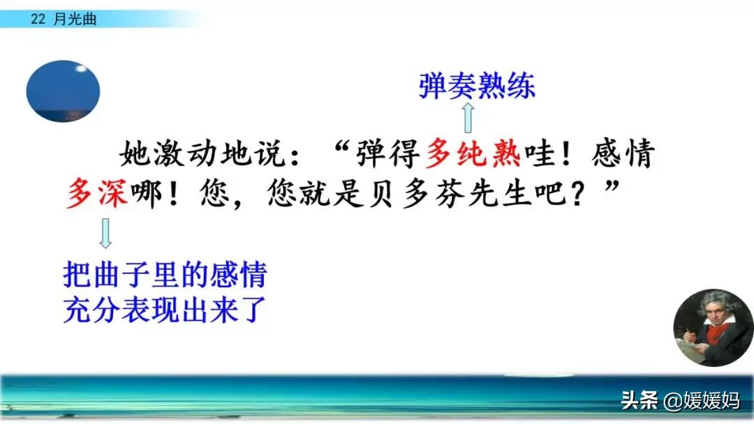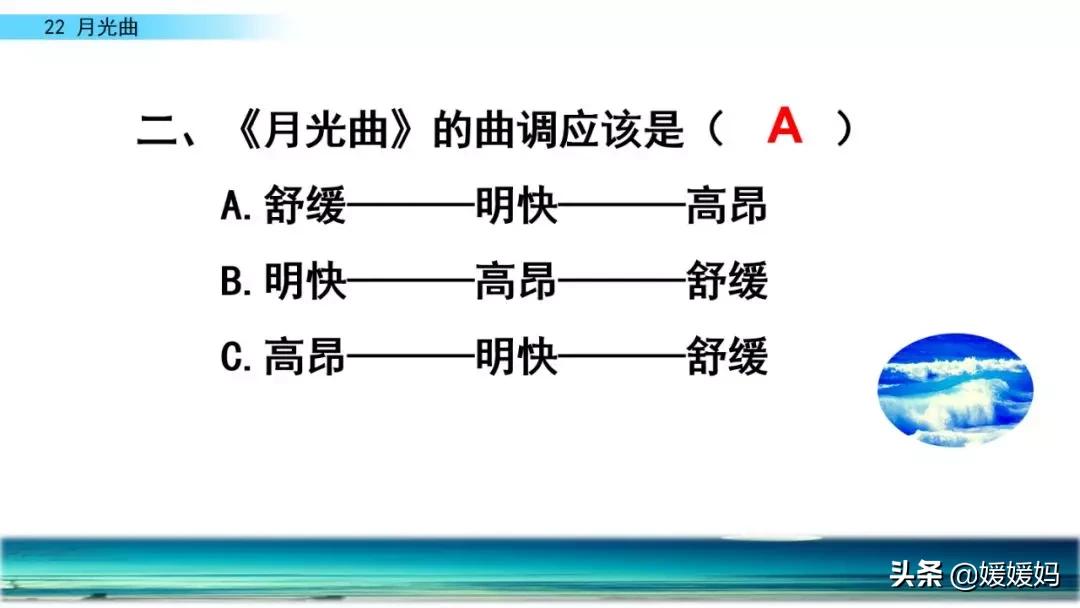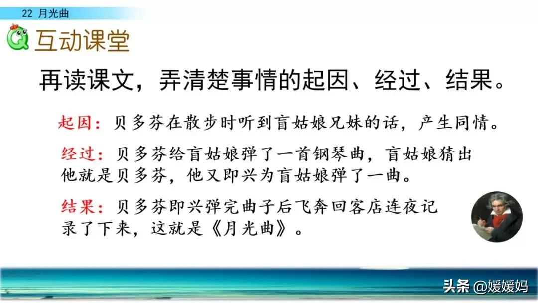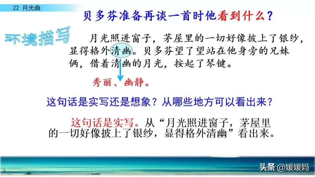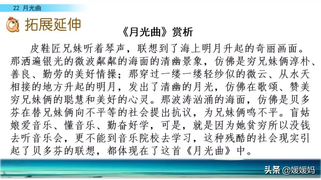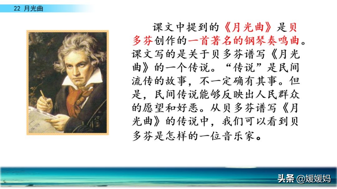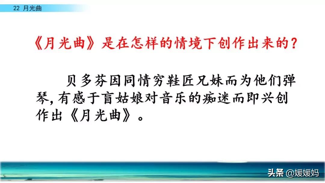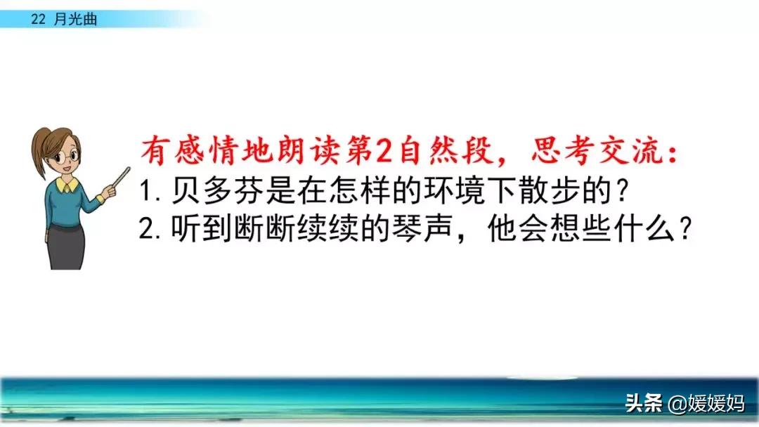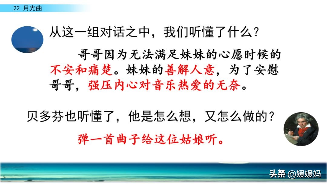 听着贝多芬的琴声,我们可以联想到海上明月升起的奇丽画面。第一幅:月亮刚从“水天相接”处升起,平静的海面上“洒遍银光”。此刻,贝多芬轻轻地按着琴键,音乐轻幽、舒缓。第二幅:月亮越升越高,穿过天空出现的“一缕缕轻纱似的微云”。随着景象的变化,音乐气势逐渐增强,曲调出现了波折。第三幅:“忽然,海面上刮起了大风,卷起了巨浪。”强音乐骤然响起。月光照耀,浪花“涌过来”,气势凶猛,音乐高昂激越,节奏越来越快。