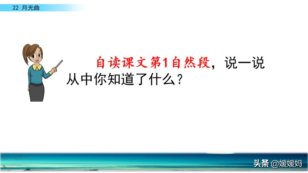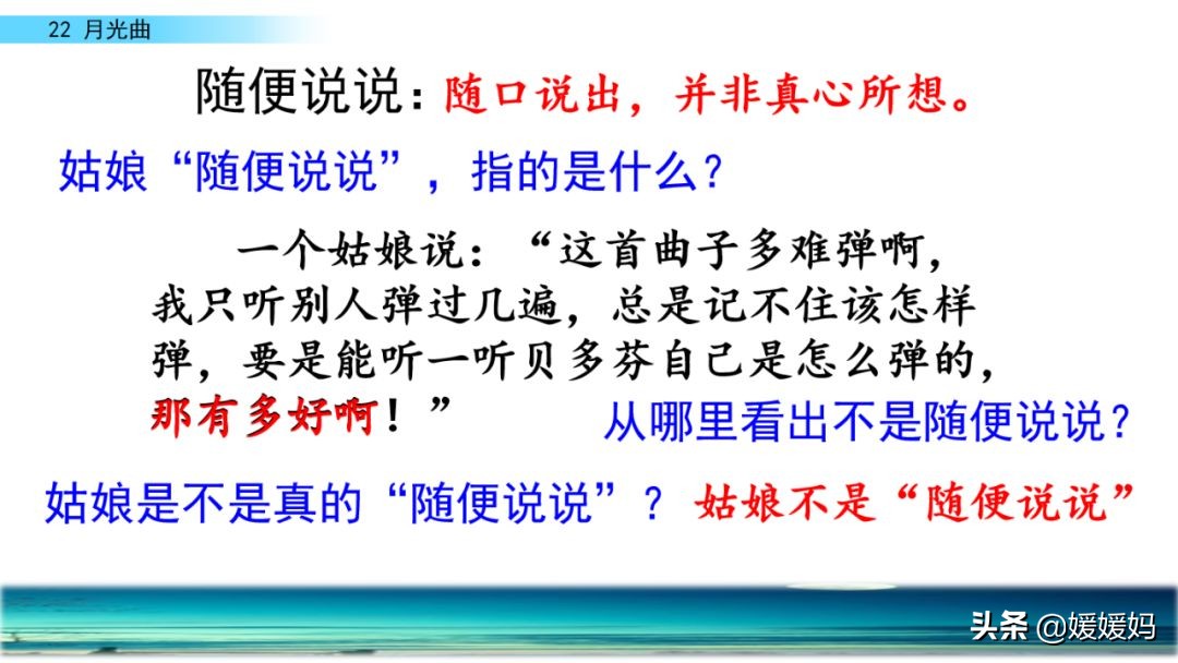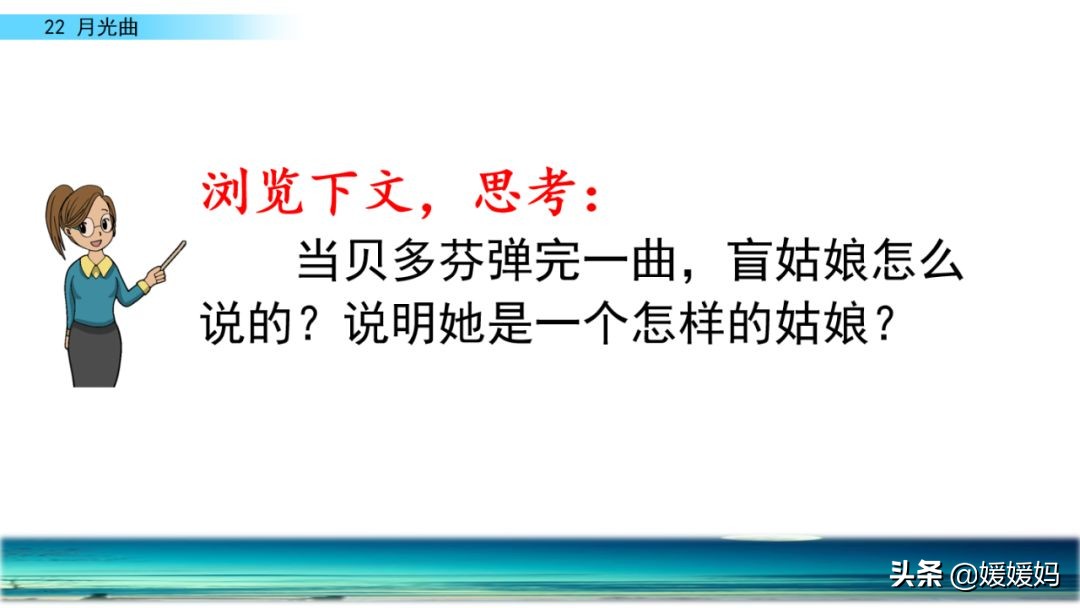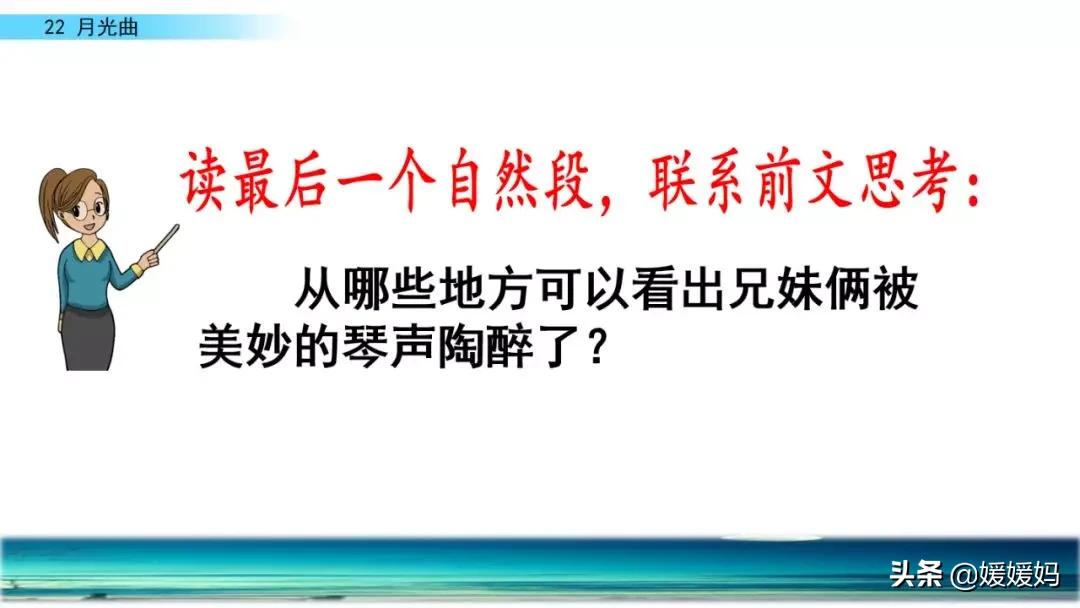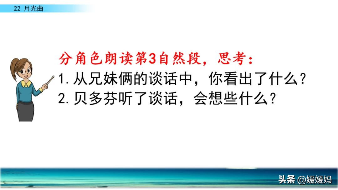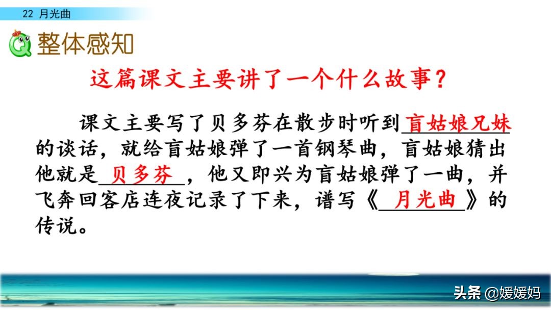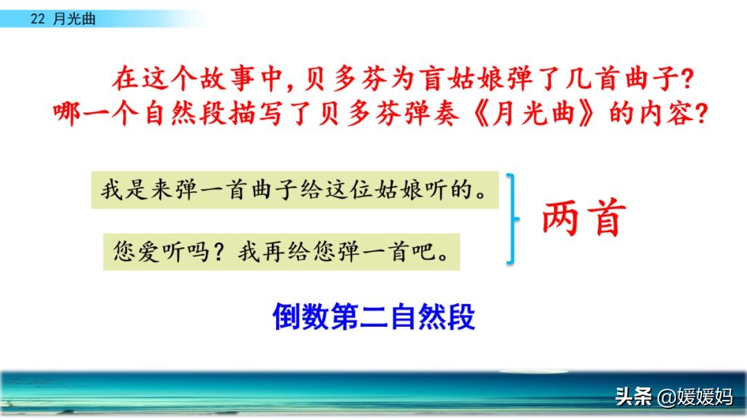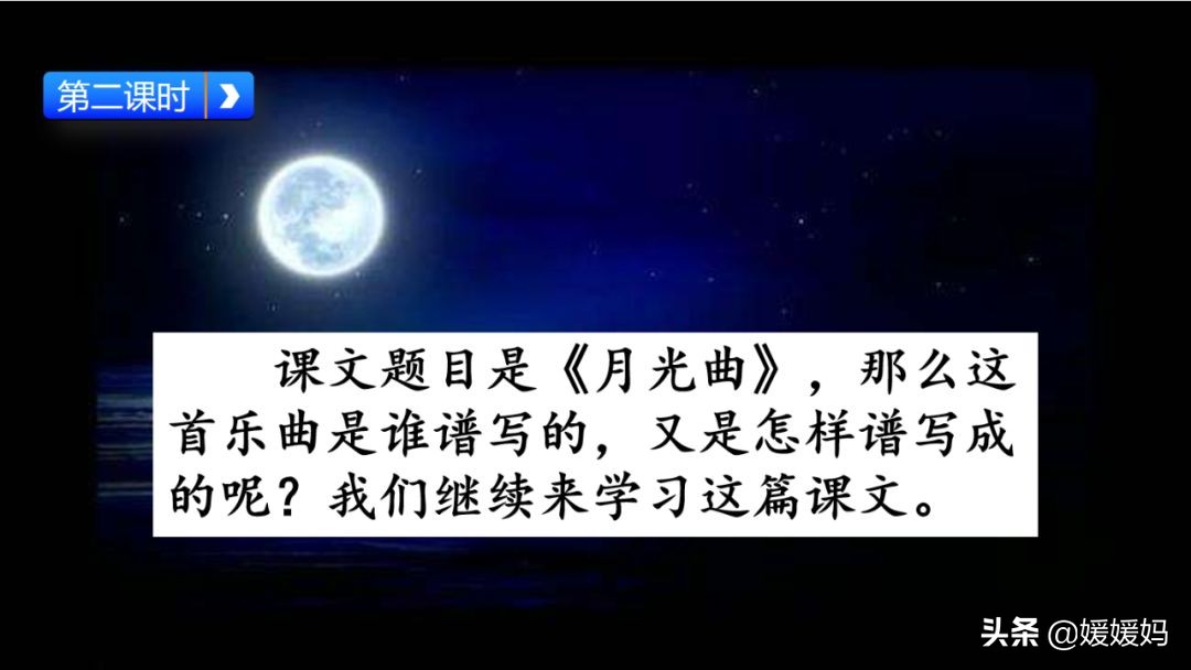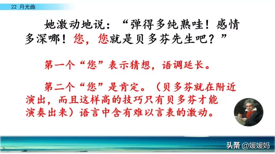 听着贝多芬的琴声,我们可以联想到海上明月升起的奇丽画面。第一幅:月亮刚从“水天相接”处升起,平静的海面上“洒遍银光”。此刻,贝多芬轻轻地按着琴键,音乐轻幽、舒缓。第二幅:月亮越升越高,穿过天空出现的“一缕缕轻纱似的微云”。随着景象的变化,音乐气势逐渐增强,曲调出现了波折。第三幅:“忽然,海面上刮起了大风,卷起了巨浪。”强音乐骤然响起。月光照耀,浪花“涌过来”,气势凶猛,音乐高昂激越,节奏越来越快。