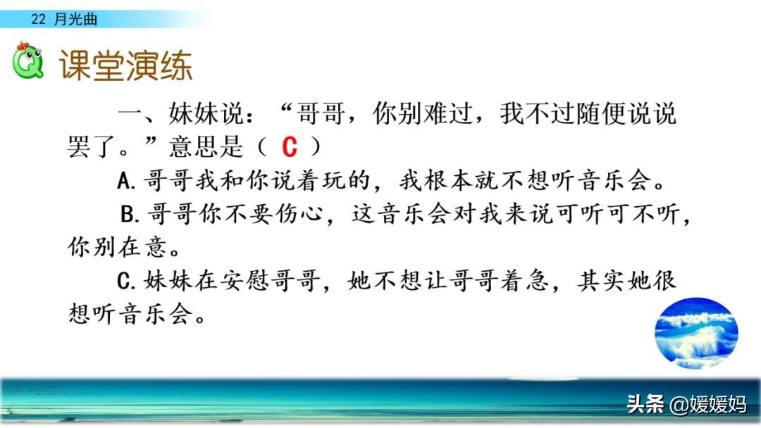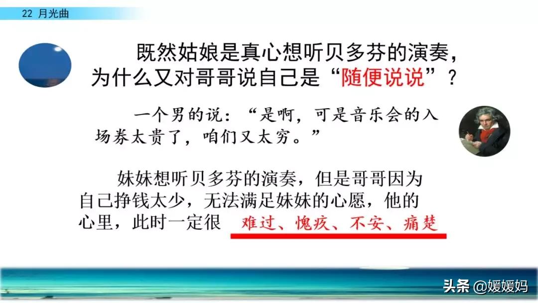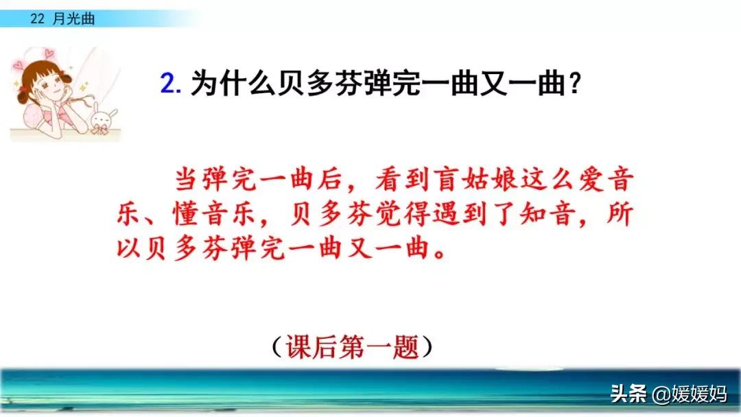 答:一个双目失明的姑娘,这么爱音乐,又这样懂音乐,这是知音啊!正因为遇到了知音,贝多芬才产生要为她弹奏第二支曲子的想法一一创作的激情油然而生。