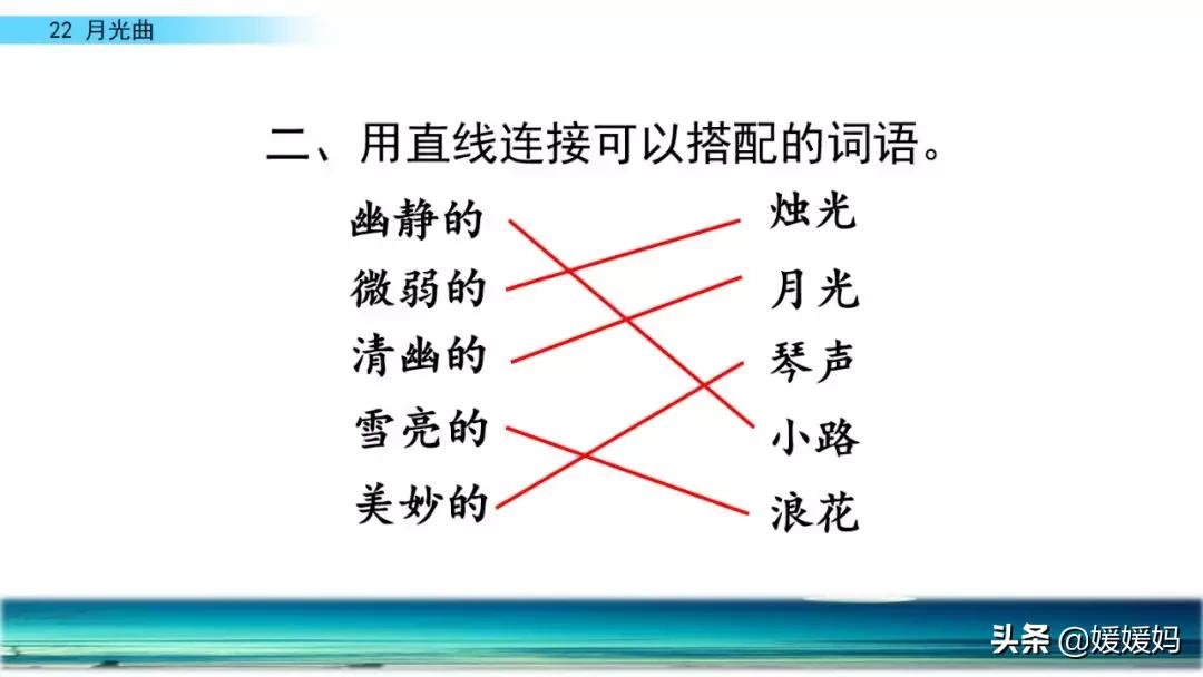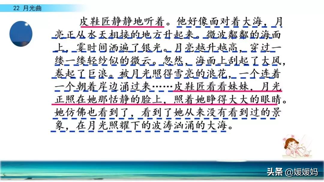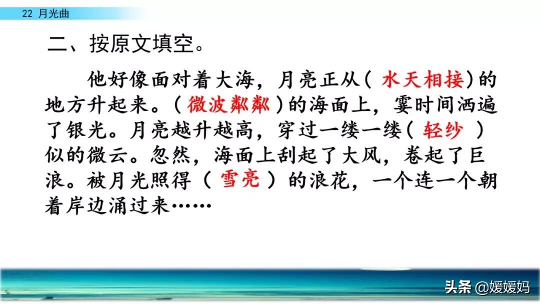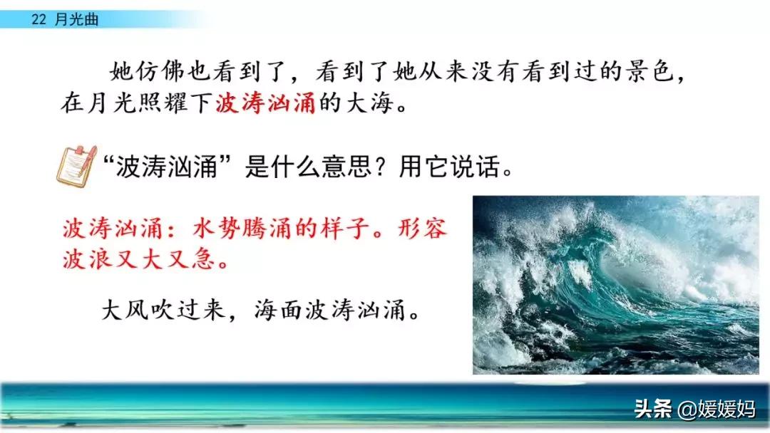 联想事物:他好像面对着大海,月亮正从水天相接的地方升起来。微波粼粼的海面上,霎时间洒遍了银光。月亮越升越高,穿过一缕一缕轻纱似的微云。忽然,海面上刮起了大风,卷起来巨浪。被月光照得雪亮的浪花,一个连一个朝着岸边涌过来……