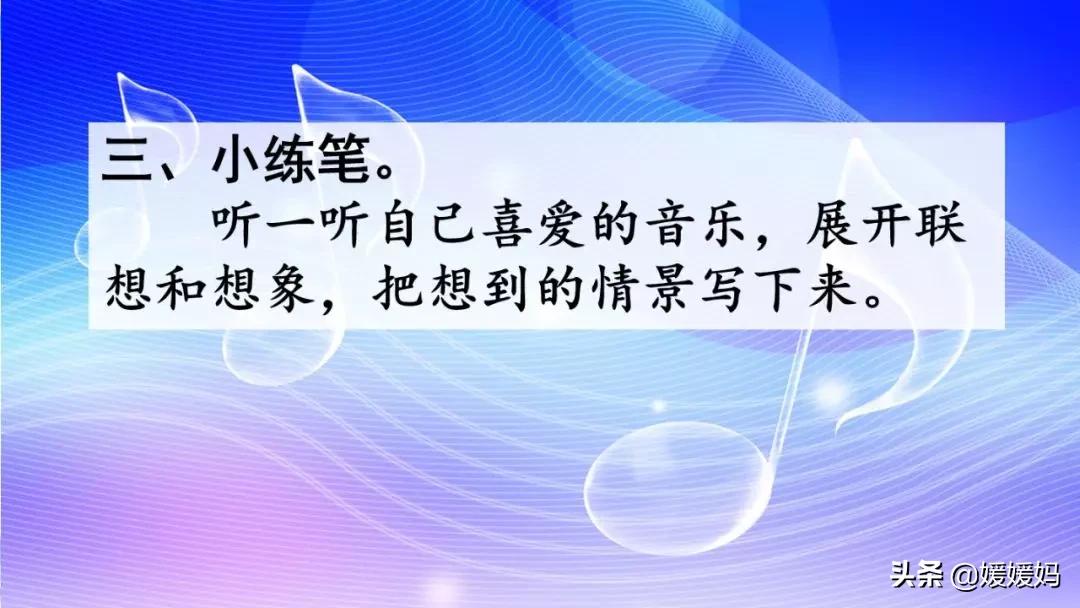 听一听自己喜爱的音乐,展开联想和想象,把想到的情景写下来。
