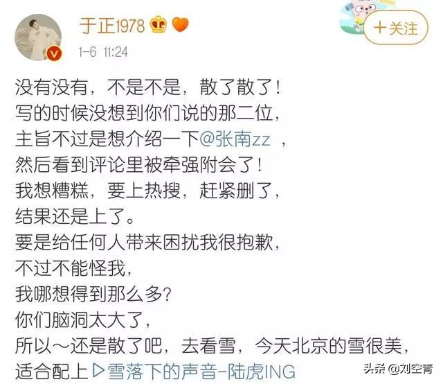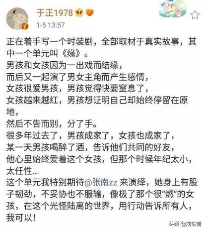 1月5日,于正发了一个微博,随后秒删,很有看头。