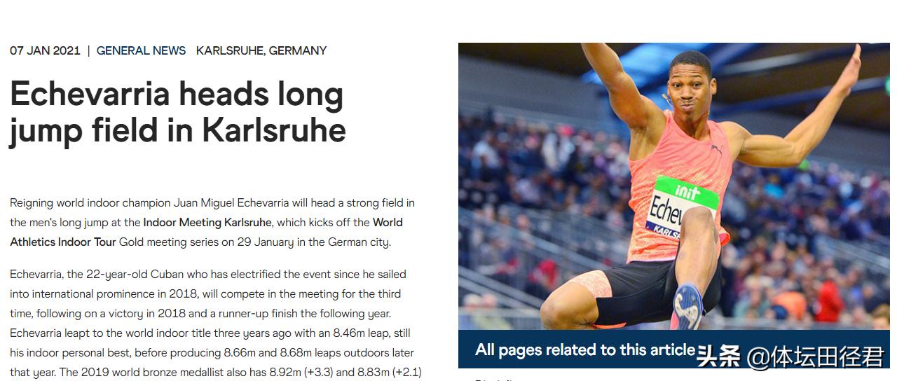 北京时间1月8日,世界田联官网刊文,22岁古巴跳远超级天才埃切瓦里亚将出战月底1月29日举行的新赛季室内巡回赛首站,德国卡尔斯鲁厄站比赛。埃切瓦里亚是东京奥运周期内横空出世的天赋小将,多次跳出8米50以上好成绩,超风速创造8米92,潜力无限,有望打破尘封三十年之久的8米95世界纪录,带进9米大关。