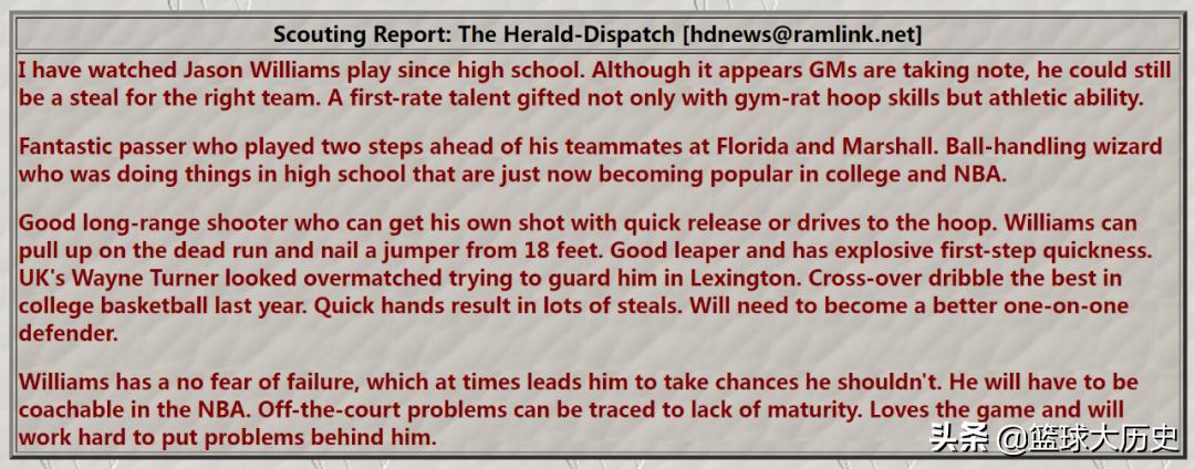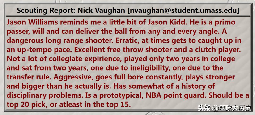 在当时,一份选秀报告上对白巧克力是这么描述的:杰森威廉姆斯让人想起了基德,他是一个一流的传球手,能够在任何位置用任何角度传球;远投能力出色,有时候会进入节奏,不过不稳定;罚球能力优秀,关键时刻靠得住。