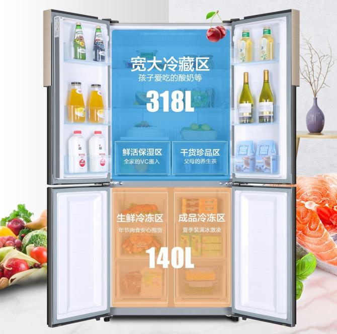 此款冰箱正面板的中央位置,是其隐藏式把手。隐藏式把手既让冰箱的一体性得到了极大保证,更可以防止在拥挤的环境下对把手进行磕碰。冰箱靠右的位置,是LED显示屏和操作按键。冰箱分为了上下两层设计,根据食材的不同之需,被为5个储藏区域,分别为:宽大冷藏区、果蔬保湿区、冷藏珍品区、冷冻成品区、冷冻生鲜区,些分区是安排的很合理,涵盖了我们日常使用冰箱时绝大多数的食材,用户可根据食材的保鲜需求,自由选择。