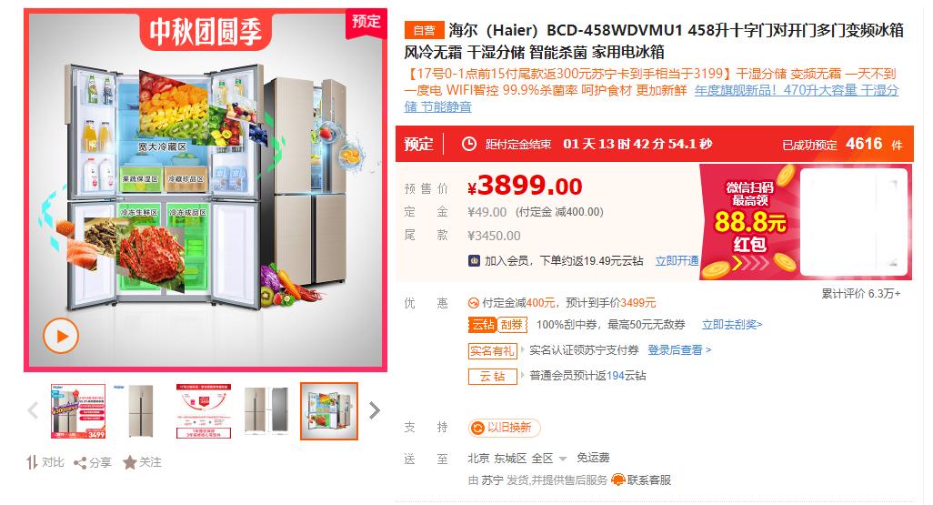 综合以上几点,海尔BCD-458WDVMU1冰箱是可以完美解决用户所有疑虑的一款产品,海尔大品牌、458L容量以及优质的保鲜性能。同时此款外层使用了兼具时尚质感与良好触感的拉丝金属面板,整体采用了十字对开门设计,更是为冰箱的面板增添了高贵质感,很适合家庭使用。现在苏宁上更是进行爆款促销,付49元定金就可以立减400元,3899元的产品最后入手仅需3499元。