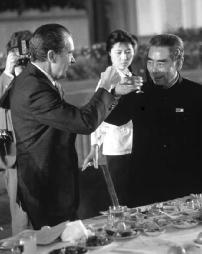 在尼克松当时的告别晚宴上,尼克松夫人对餐桌上一个印有熊猫图案的香烟盒很感兴趣,一遍又一遍地摆弄着。周总理敏锐地捕捉到了这一细节,并问尼克松夫人是否喜欢这盒香烟。尼克松夫人回答说:“我不抽烟,但我喜欢熊猫。我可以把这烟盒拿走吗?”周总理说:“当然,你可以拿走香烟,而且中国政府还会给你们一对真正的大熊猫。”