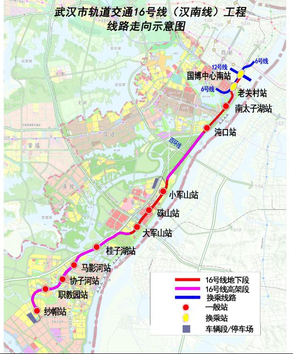 武汉地铁16号线,南起汉南区纱帽街周家河站,北至汉阳区国博中心南站,全长约33.1公里,设站12座。其中,高架站5座、地下站7座。