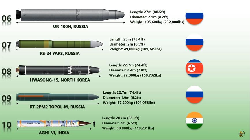 先来看TOP10中尺寸最小的洲际弹道导弹,应该是印度的“烈火-6”洲际弹道导弹,该型洲际弹道导弹目前尚在研制当中,其尺寸是外界根据“烈火-5”和射程推定的,预测其长度应该在20米以上,重量在50吨左右。“烈火-6”的最大射程在8000-1000公里之间。
