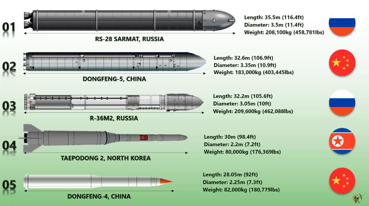 然后就是最长、最大、最粗的RS-28“萨尔马特”了,这是截至目前俄罗斯战略火箭兵部队最先进的洲际弹道导弹,服役后计划取代R-36M2“撒旦”洲际弹道导弹。“萨尔马特”洲际弹道导弹全长35.5米,弹径3.5米,起飞重量208吨。由于尺寸和重量原因,目前全球尺寸TOP5的洲际弹道导弹全部是井下发射,贮存-运输-发射一体车承受不起这些超级大家伙(没有介绍到的请看图感受)。