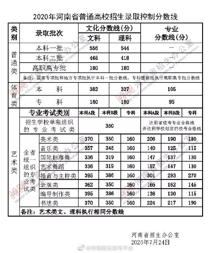 映象网讯 (记者 陈伟然)7月25日,河南高招录取分数线出炉,本科一批文科为556分、理科为544分,本科二批文科为465分、理科为418分。