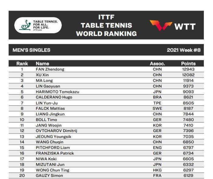 全新改版的2021年世界排名,以每周一期的方式公布5个单项的排名,本期是2021年第9期。男单方面,樊振东以12943分占据第一,许昕12082分位列第二,马龙11914分第三,林高远9373分位居第四。日本的张本智和位居第五,是国乒外排名最高的选手。巴西的卡尔德拉诺-雨果、中国台北的林昀儒、瑞典名将法尔克、梁靖昆和德国名将波尔分别排在六至十位。