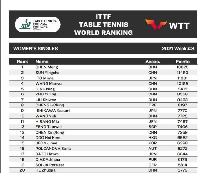 国际乒联最新女单排名。图片来源:国际乒联官网