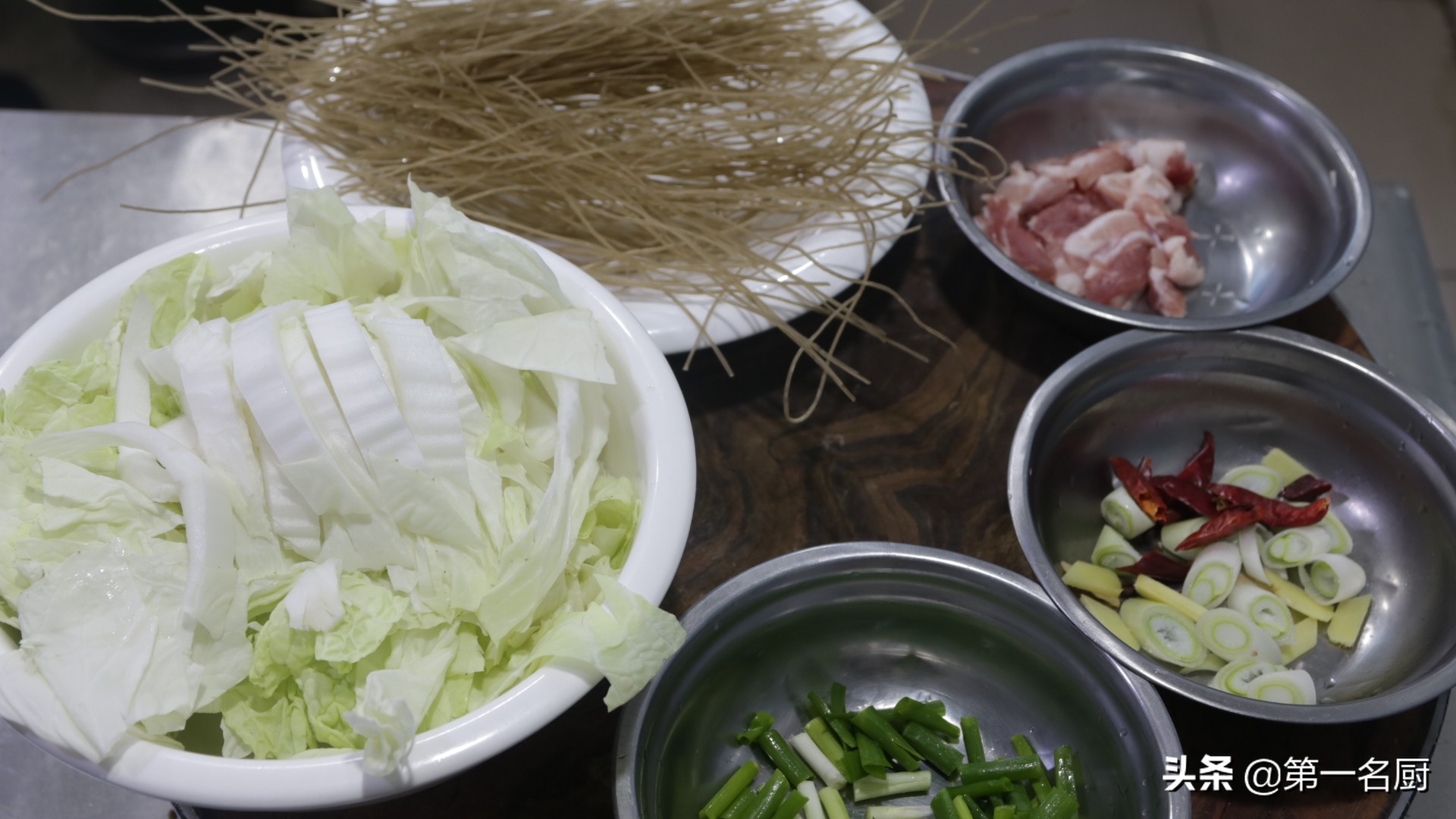 食材:白菜,粉条,五花肉,生姜,小葱,花椒,红干椒,大葱