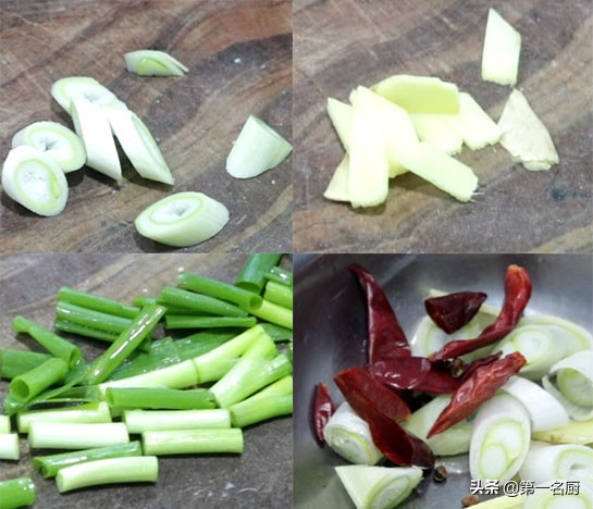 大葱半根切成马蹄片;生姜一小块切成姜片;小葱三根切成段;再抓入几粒花椒,一小撮红干椒备用。