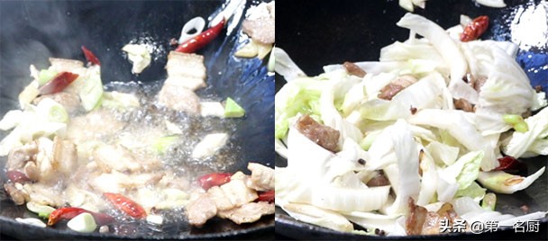 炒锅烧热,添入食用油滑锅,再添入半勺食用油,放入肉片翻炒,炒出五花肉里面的肥油,放入葱姜和大料爆香,先倒入白菜帮翻炒片刻,炒至断生后,再下入白菜叶,快速翻炒几下。