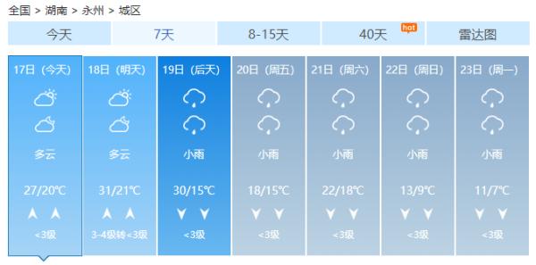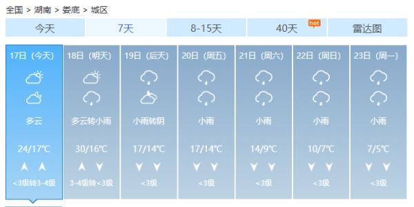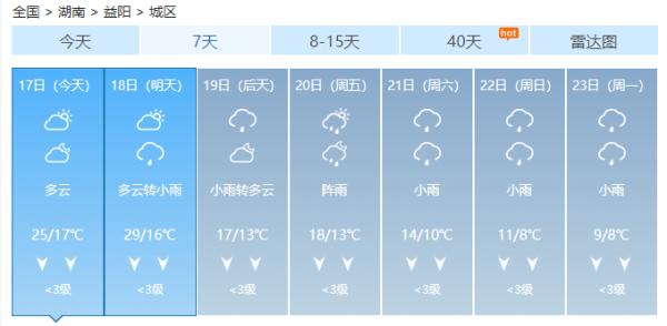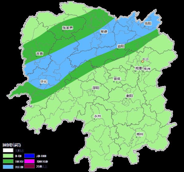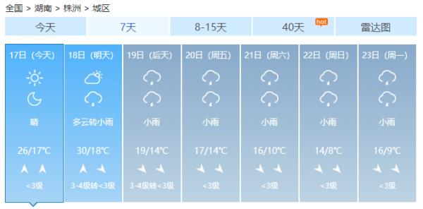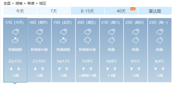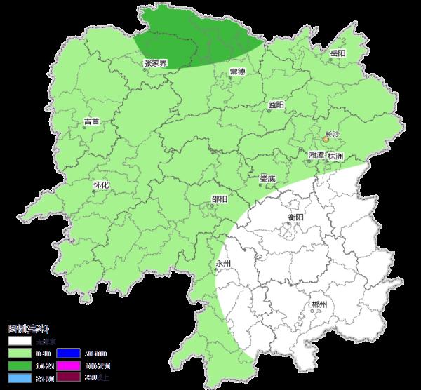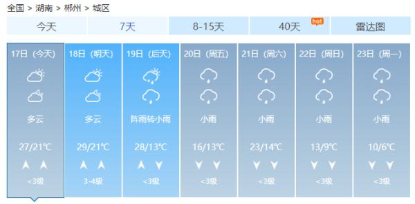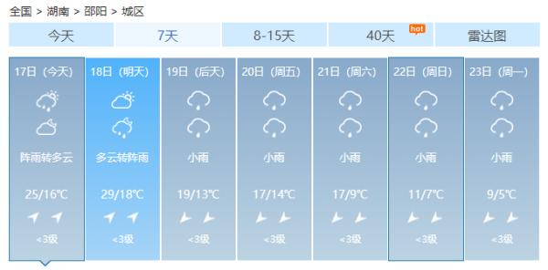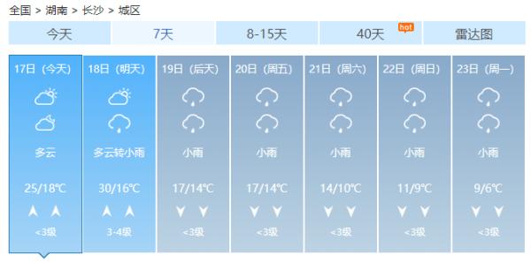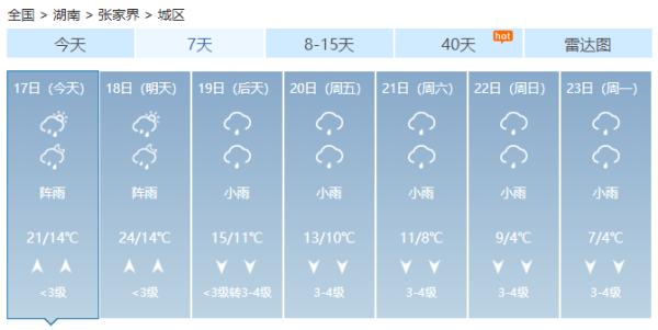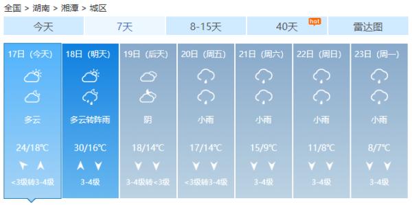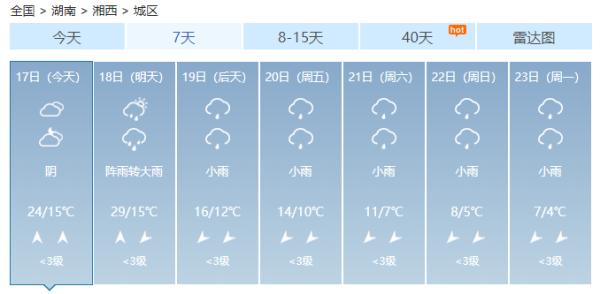 11月17日20时至18日20时:湘东南阴天间多云,其他地区阴天有阵雨或雷阵雨,其中张家界、常德局地中雨;南风3~4级;最高气温湘西、湘北25~27℃,湘东南28~30℃,其他地区25~27℃;最低气温湘西、湘北14~16℃,其他地区17~19℃。