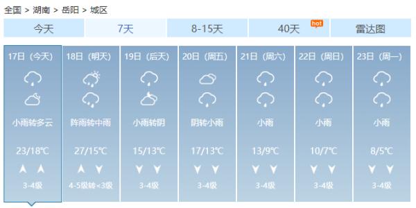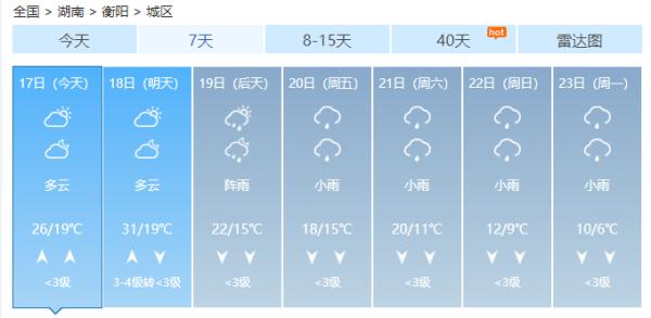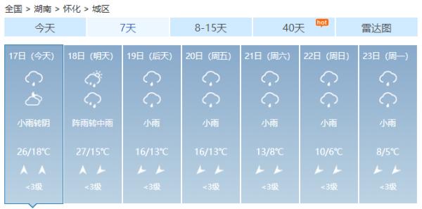 11月18日20时至19日20时:湘东南多云转阴天,有阵雨或雷阵雨,其他地区阴天有阵雨或雷阵雨,湘中以北部分中雨,其中湘西州南部、怀化中北部、常德南部、益阳北部、岳阳北部局地大到暴雨;南风3~4级转北风3~4级;最高气温湘北16~18℃,湘东南27~29℃,其他地区19~21℃;最低气温湘西、湘北15~17℃,其他地区18~20℃。