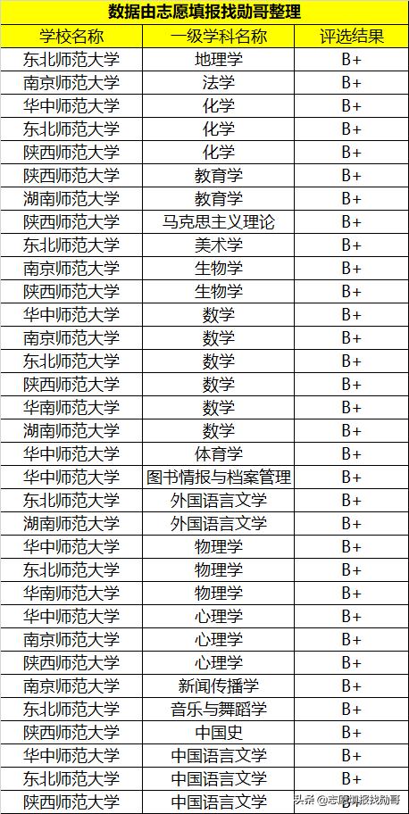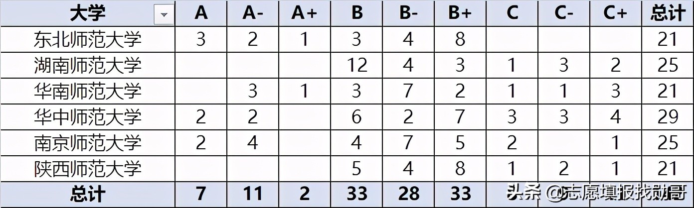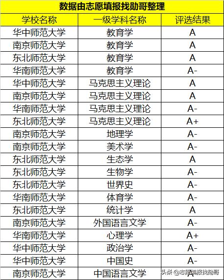 这6所大学中,只有4所师范大学拥有A-以上的学科,分别是华中师范大学、南京师范大学、东北师范大学、华南师范大学。