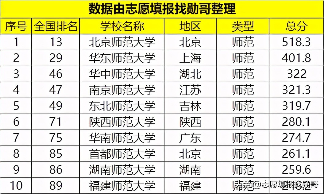 近期软科中国大学排名更新了2021年大学排行榜单,我们可以参考其中师范类院校排名前十的院校来进行参考。