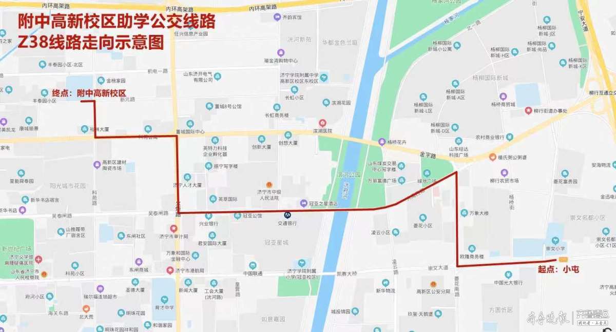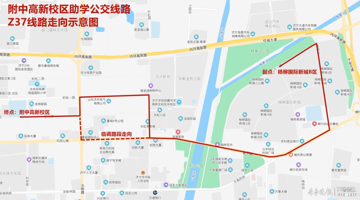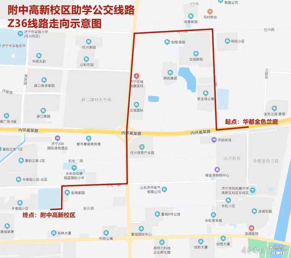 线路一(即Z36):从任城大道华都金色兰庭站点发车,沿任城大道—长虹路—任兴路—火炬路—机电一路—科苑路—新元路—附中高新校区,傍晚沿原路返回,运营早、晚2个班次。